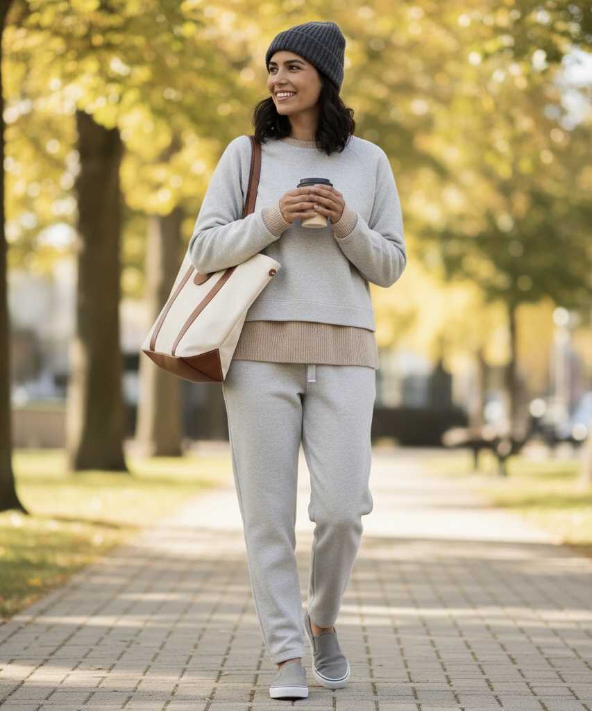 日曜はのんびりお散歩。セットアップで楽ちんおしゃれ! ニットをレイヤードして防寒も◎。来週の準備もこれでモチベUP。