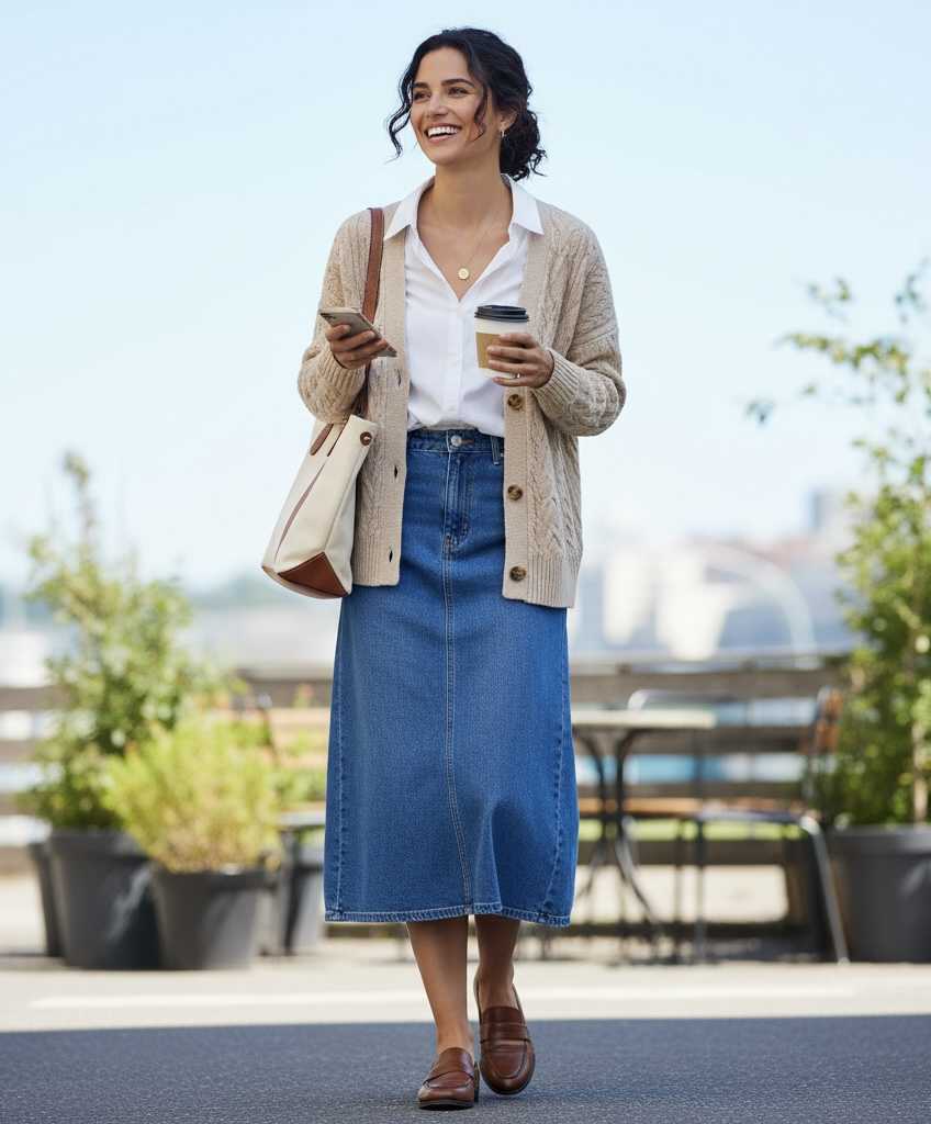 朝の忙しい月曜に最適。カーディガンを羽織るだけで即おしゃれ♡ デニムスカートで動きやすく、オフィスでもカジュアルデートでもOK。気温差に合わせてインナーに薄手ニットをプラスしてね!