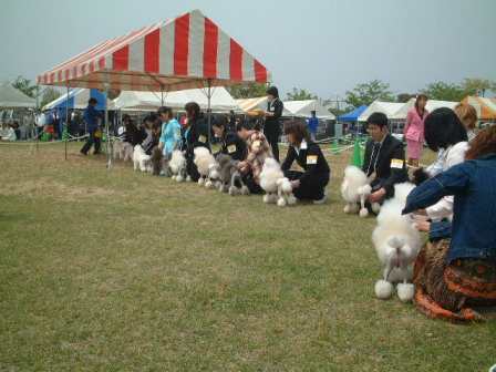 今日は北九州でドッグショーが開かれるというので電車で2時間かけて見学に行ってきました。いつもトリミングしてくれるオーナーがショーに参加するということだったのでその応援もかねて。。。ショードッグがどんなものかをお勉強に。一度屋内での競技会をインテック大阪で見ているのですがお外では初めてなので雨が降らないことを祈りながら~~~黒崎駅で下車、タクシーに乗って目的地の洞北緑地公園へ・・・10時45分からトイプードルの審査が始まります。参加500頭のうち、120頭くらいがプードルだっていうからすごいっ!!!トリミングスクールの生徒さんたちがたくさんプードル連れてました!!それぞれ有名な犬舎からご自慢のプードル勢ぞろい。軽やかな足取りでフィールドをランニング!オーナーが連れて行った4頭は今回惜しくも良い成績を修められなかったけれど私的には、たくさんのプードルを見ることができて大満足~~っ!!楽しかったです~!!見てるうちに我が家のワンコたちに会いたくなっっちゃいました(笑)我が家のわんこNo.3 ロココ・・・ ↓こんなになっちゃいました!!!(=^・^=)体重は1600グラムほど。。。こんなに大きくなりました~~