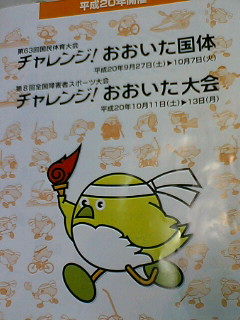 何でしょ~??台風の影響なのか?今日はとっても風が強くて歩くのも大変な感じですっ!!(台風並み)自転車で通学している娘大丈夫かな?とちょっと心配・・・徒歩通学の次女も歩く距離が半端でないのでお助け電話がかかってくるに違いない・・ムム。。兵庫国体!駒大苫小牧、残念ながら敗れましたが田中君も斉藤君もさわやかな風を吹かせてくれました(*^_^*)この夏は、久しぶりに高校生野球を楽しみました。それぞれ球児のみなんさんの未来が輝かしいものであって欲しい・・・そう願わずにはいられません。ところで兵庫国体といえば。。。そのマスコットは不死鳥をイメージに作られたその名も「はばタン」!!「はーばタン♪!はーばタンッ♪はーばータン、みんなのはばタン♪」(歌もあります、振り付けももちろん!(^^)!)はばタンはPR活動のためにいろんな場所へ出没~っ!!2年間兵庫ですごした娘たちは、はばタンが大好きですぅ。ところで・・・・2年後ですがーーーーーなんと大分で国体が・・・はばタンファンの我が家?は気になる、そのマスコット!先月市役所でみたのは。。。もしやあれが????県鳥である「めじろ」(知ってる?)をモチーフにして描かれたその名は「めじろん」(オイッ!!!ふつーやん、それ、そのままやん(T_T)) ↓ちょっとぉ~目が笑ってないよー(爆)「みんなのめじろん~♪」になるかなぁ!!???