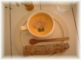 昨日、友人と何度かここでご紹介した雑貨&カフェのお店「Pot」さんで開かれたイベントへ行ってきました。とても盛況で店内は若いお母さんたちをはじめたくさんのお客さんでいっぱい!!!(*^_^*)お店からパンを焼く香ばしいにおいが鼻をくすぐります。ちょうどお昼前でしたので二人で「かぼちゃスープとお芋のベーグル」をいただきました。ベーグルってドーナツ型だと思っていた私たちはちょっと衝撃~!!お芋のベーグルとても美味しかったです。スープはかぼちゃの甘味がよく活かされていてこれまた美味!!お持ち帰りにシナモンとお芋、甘栗と黒ゴマ、白ゴマのベーグルを買って帰りました^-^そのほか布小物や手作りのお洋服などがありましたよ~またこんな楽しいイベントがあったらぜひ行きたいです♪さてさてお次は。。。。お天気がいいので次なる雑貨ショップへ向かって車を走らせます。かんたん(西大分にある地名)から山を越えて賀来へとおりましてHPもお持ちで、何度も雑誌等で取り上げられている今や地元はおろか全国的にも有名なショップ「チャービル」さんへ。。。本当に久しぶりに訪れた店内はアンティークやナチュラルな雑貨がいっぱい。。。。オーナーさんのお好みがはっきりしていて厳選されたどの雑貨もしっくり落ち着いた表情です。最近は併設のCafeスペースもにぎわっていて、自宅ショップといえどお客さんのニーズにこたえてくれる憩いの場所になっているようでした。まずは、店内入って正面から・・・友人にモデルになってもらって、角度変えたところから。入ってすぐ右後ろの棚です。右奥のディスプレイはこんな感じ。白いタイルは確か昔ご主人が作ってくださったとか・・・一番気に入ったのがこの棚です^-^この引き出しの持ってる味わい~~~ステキですね!ショップの横に作られたCafe...ドアといいシェルフといい完全に計算されたさりげなさがステキです。あと大きなステンドグラスがはめられたアンティークドア♪バッテリー切れで写せませんでした。。。残念!!(>_