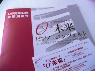 22日、ピアノ演奏家たちのグループ『O'未来』の定期演奏会がありました。私の友人はグループ結成当時からほとんど毎回出演しているので楽しみにしている演奏会です。今年は25周年記念の演奏会ということでポーランド・シレジア・フィルハーモニー管弦楽団を迎え~コンツェルトの夕べ~と題し、ピアノコンツェルトをはじめヴァイオリン、フルートのコンツェルトの演奏がありました。今回はO'未来会員の生徒さんたちがチャレンジということで1部は小学生、中学生の方たちが日ごろの練習の成果を遺憾なく発揮。楽団との共演に少し緊張ぎみの生徒さんもいたようですが一生懸命に演奏する姿が微笑ましかったです。大学進学直前まで一緒の門下生だった私は音楽とは別の道を選んだのですが友人は音楽家の道をひたすら頑張って極めてきた人。自己研鑽し続ける姿に心うたれます。お互い時間が合わなくてなかなか会えないのですがゆっくりお茶しながらたまには昔話もいいかなぁ~と思っています♪