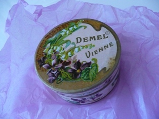 Little Fairyさんから届いたDEMELのチョコ&すみれの砂糖づけお目当てはアンティーク風のボックス!!スミレがとてもいい感じ♪弱いです箱もの。缶もの・・・三段になってます!真ん中がスミレのお砂糖づけ~♪可愛いボックスにキャーキャー騒いでいたら。。。横から「中味もでしょっっ!!」って~~~はいもちろん