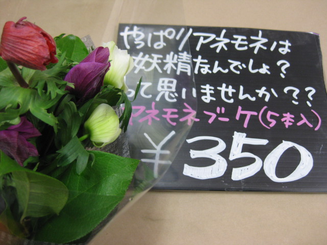 もぉホントすみません。何度も更新しちゃって。どんだけ暇なんだ、って話ですよね。帰るの寒いのとうだうだ言っちゃってホントすみません。結局最後まで営業してるじゃないのってかんじですよね。←あたりまえ私が書くとこんなポップになっちゃいます。ホントすみません。でもやっぱりアネモネって妖精なんでしょ?そうでしょ?そう思いませんか。。。えぇえぇ 大好きなんです、アネモネ。。。さて。ではホントに閉店準備に入ります。今日もお疲れ様でした。