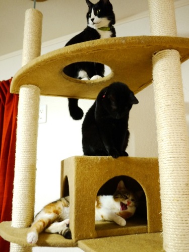 キャットタワーは大人気。一応、てっぺん取ったヒトがえらいみたいな?てっぺんはみんなわりと死守するよね。 コンニャロコンニャロと月子さん 大暴れ。 「月子ちゃんが暴れてます」とジーナより報告が。 てっぺん行きたいのにぃ、と月子さん。 キャットタワーでの大騒ぎに 迷惑顔の近隣住民。 てっぺん死守するはっちゃんも迷惑顔。 うるさすぎてみんなから距離を置かれ、しょんぼりする月子さん。 毎晩深夜に大運動会のにゃんずたち。主に月子。 賃貸の上の階に住んでいたら、きっと毎晩下の階の部屋の人に怒鳴り込まれること必至。 ネコなのに、ドタバタ走る。しなやかに動き回ることができない我が家のにゃんずたち。 今日も寒いです。明日は雪かいな?
