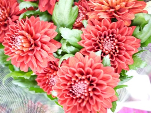 ダリア「ピンククオーツ」はホントきれいな色。 「ファンシーローラ」というスプレーバラもかわいい。 カーネーションもいい感じ。 白いガーベラ好きなんだけど、人気はいまいち?かわいいのにぃ ドーンと茶色の大輪マム「ココア」。毎年仕入れるけど毎年不人気。じゃあなぜ毎年買うのかしらね。これね、ミルクココア色だけど、ビターココアの色なら売る自信あるわ。マジで。 こぼれちゃいそうな「ピーチブロッサム」。コレも毎年買う。 アネシーは定番でたいてい置いてますが。 年末だけの「イトギク」。不思議な花で、花びらがどんどん成長するよね。花火みたいに大きくなる。 真っ赤な「パンテオン」というマム。こちらも好き。 年末はクラシックマム系がどかんと入荷しました。 写真はないけど、今回いちばん人気だった「誠」はすごかった。ホントすごかったの。あっという間に売り切れたの。セリ人君にすすめられて、「え~・・たっかーい・・・売れるのぉぉぉ?」としぶしぶ買ったのだけど、見たらステキすぎてびっくりした。セリでは不人気だったけど、みんななんで買わないのかしらアホちゃうの、と思ってた。うちはすすめられて買った最初のと、後で追加でまた買った。ホントすごかったよ。顔くらいの大きさで、まんまるで、菊とは思えないまるでダリア。あれはね、また来年も買おう。お客さんも追加で買いに来て、「えー!アレまた欲しかったー!飾ったらすごくよかったから」って。「また入る?入ったら欲しいわ。お友達にもどこで買ったのか聞かれて、このお花屋さんすすめたのにぃ。でもそうよね、あれは売り切れちゃうわよね」って。ちなみにうちのスタッフも全員1本ずつ買っていきましたもの。こりゃすごい、って。私?私はね、そんな人気品種は売るに限ると思って控えました。仕入値、べらぼうに高かったですからね。でもまぁダリアと思えば高くないか。。ダリアより長持ちするしいーんちゃうの。 年末の市場は洋花が少なくて、ノイローゼになりそうに少なくて。そしてデラ高だったんですが。少ないながらもたくさんあるように見せかけて売るしかなく。おかげで「少ない」とは言われなかったな。いやまぁ他にも色々狂ったようにあったわけだから、あれで少ないって言われたら「あらお客さん何千本必要ですかー?」って切り替えしちゃう。 アレンジも山ほど作ったんだけど写真撮る暇なかった。大きめのオトナっぽいアレンジと、小さめのかわいらしいアレンジ。かわいい系からどんどん売れて、最後、数個残ったアレンジは31日の夜にみんなで持ち帰って各自自宅に。 ハボタンがいっぱいあったから、どうしたものかとハボタンと千両だけをぎゅっと束ねた「ハボタンブーケ」を作ったら、みんなに「かわいいけどこんなの売れるのか」「こんなにハボタンばっかり飾るかしら」とさんざん言われたものの完売したぞなもし。「ハボタンブーケ完売です!」の声に無言のガッツポーズ。 そんなこんなな年末も終わり、年があけてだいぶまったり。お墓参りのお客さんはぼちぼち来るものの、今日はもうフィーバーしてないし。 5日までは16時閉店でいきますので、さてとそれではそろそろ帰りまする。 明日は初市だってさ。ってことで、ちょっくら明日は市場をのぞきに行ってきます。