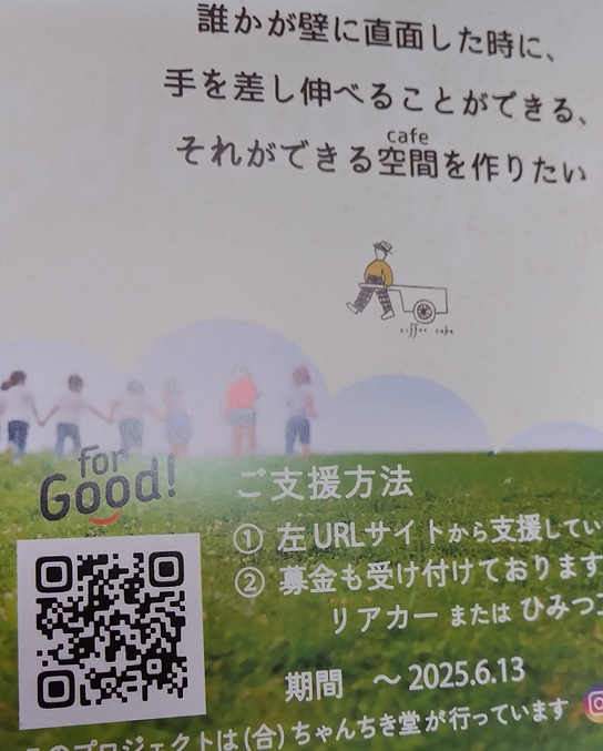 今日もお店の前を ちゃんちき堂さんがリヤカーを引いて歩いてた。「あー!ちゃんちき堂さーん!!」と呼び止めておいしいシフォンケーキを買ったよ♪いつもは道路の向こう側を歩いているのに、今日はこっち側を歩いてた。私に用があったようで「このチラシを置かせてもらえませんか?」って。「もちろんもちろん、なになに?」クラファンを立ち上げてるらしい。私は絶賛応援するぜ!ってことで 早速支援したよん。ちゃんちき堂さんは ただのシフォンケーキ屋さんではない。いろんな支援を継続している人でここ一年はずっと、能登の支援に走り回ってた。能登の物産展を開いたり、能登に出向いたりして能登の人々のことを忘れ去られないよう 継続的に発信してるのだ。更に、今回のクラファンでは子供たちの居場所作り の修繕工事費も募集してるらしい。詳しくは ↑ 上のQRコードを読み取ってみてください。誰かが壁に直面したとき手を差し伸べることができるそんな空間を作りたいその想い そのまんまの活動を続けているちゃんちき堂さん。心から 応援してます。ご自身が 壁にぶつかり 苦悩したからこそあんなにもやさしい笑顔の 芯の通った活動ができる方なんだと思う。本来であれば 能登の災害についても国が動くべき事案で支援も復興も いまだままならない状況が放置されてる中報道も減り、能登の人たちは自分たちの存在が忘れ去られていくという不安の中にいる。ちゃんちき堂さんは、そういう人々の声と向き合い出来ることを 粛々と行っている。おいしいシフォンケーキを売ってるだけじゃない。だから私も微力ながら ちゃんちき堂さんを見かけたら絶対シフォンケーキを買うんだ。うちの店の前で わいわいとおしゃべりしながらシフォンケーキを買っていたら隣のテナントの人やうちに花を買いに来たお客さんや通りすがりの人たちがなんぞなんぞ?と集まって来て みんなもシフォンケーキを購入。神出鬼没なちゃんちき堂さん、出会うとハッピーになれる、という定説通り、みんな笑顔で。クラファン、絶賛 応援お願いいたします!!そろそろ母の日なのよねー・・・何も準備でいていないが大丈夫か私。まずは人員確保から。どっしよっかなー。。。