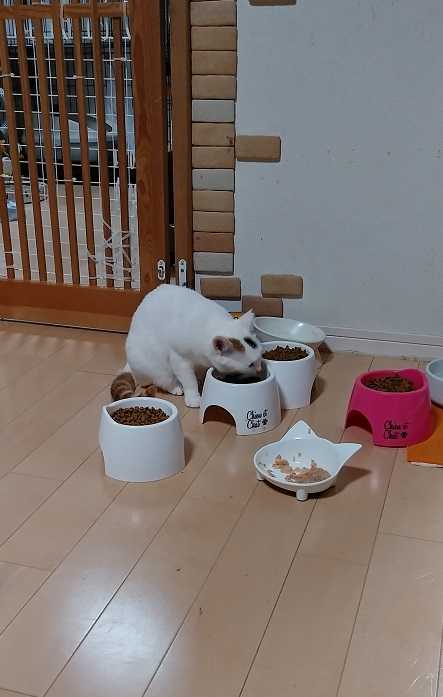 ご飯を選ぶ小梅ちゃんと、ネコ草をむさぼるなっちゃん。