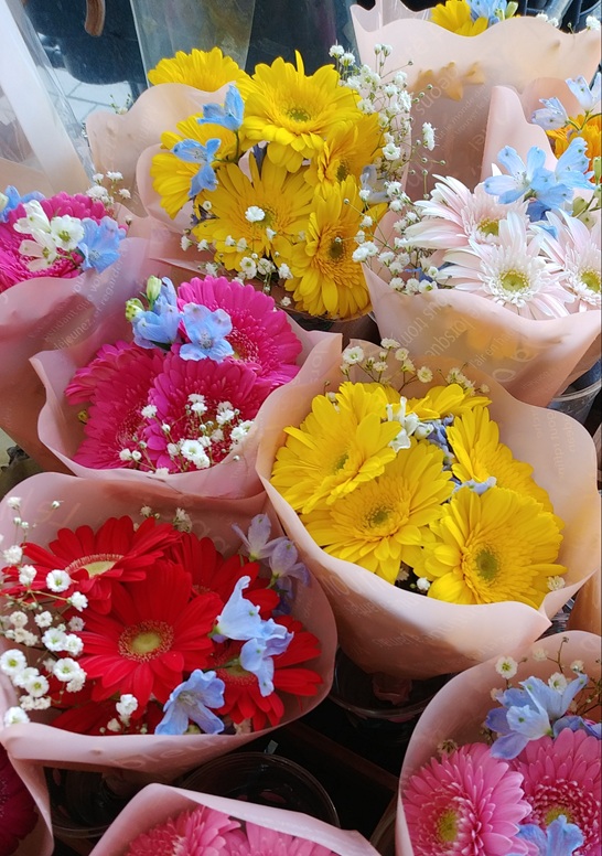ガーベラたくさん入荷したので、色別のかわいいミニブーケに。