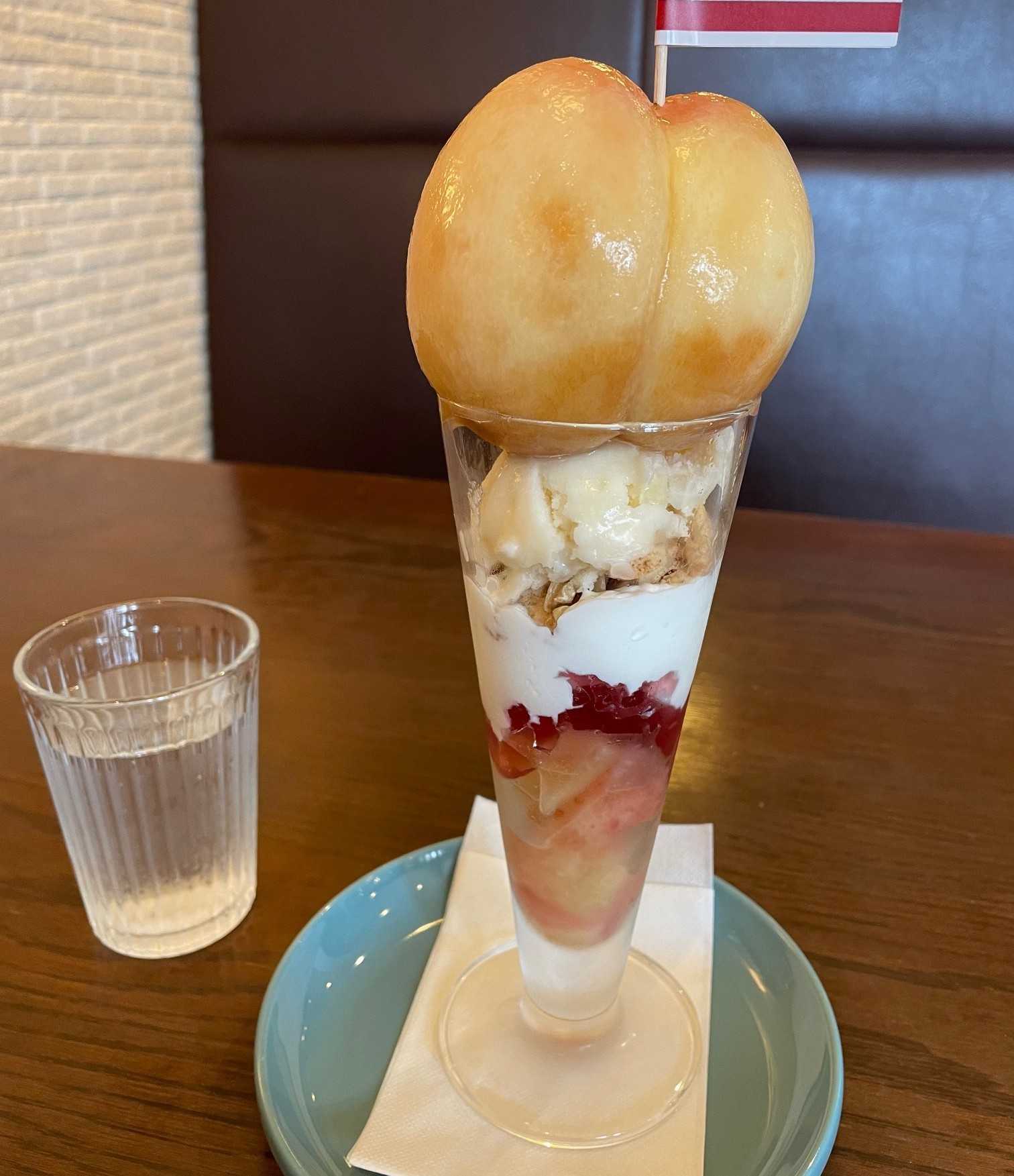 ある日の午後、ちょっといろいろ疲れててぼんやりしたくてカフェに入った。桃1個が丸々乗ったパフェ。桃の種はくりぬいてあって種があったところにはカスタードクリームが詰めてあって。めっちゃおいしかったー。