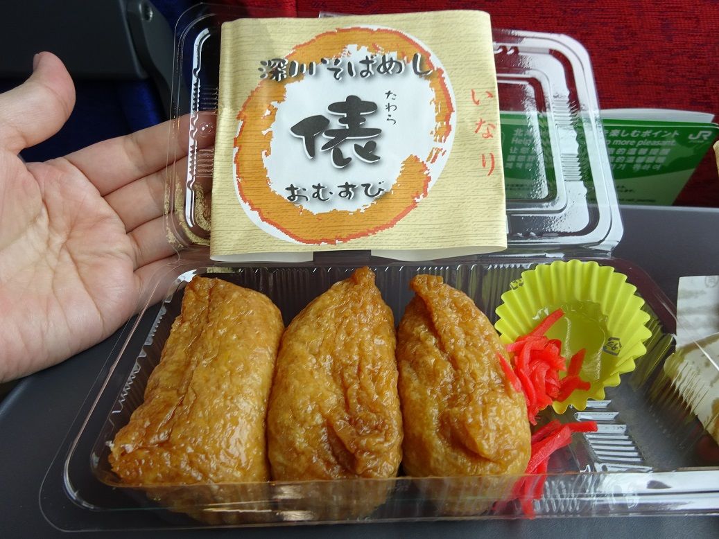 14時に近い車内で、深川駅で買ったそばめしとそばめしいなりをおいしくいただく。