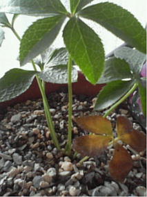 少し前からクリスマスローズの葉が茶色くなってきたのだがどんどん茶色くなってしまった。他の2鉢はなんともなっていないしこの鉢も茶色いのはこの短い葉だけで他の葉は緑色のまま。δ(´へ`●)ウーン...