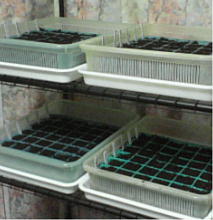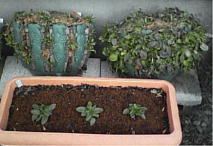 球根ベゴニアを植え替えた。ずっと、バーミキュライトを入れたいちごパックに半分くらい埋めた状態で置いていたのだが芽も大分伸びてきたのでプラスチックの5号鉢に植え替えた。大分伸びてきたと言っても伸びたのはハンギングタイプの方。一緒に植えたカメリア咲きの方はあまり伸びていない。当初から、ハンギングタイプの方が生長が良かったが、こんなに差がついてしまった。ハンギングタイプカメリア咲き先日、ガーデニングフェアに行った時に先着100名(だったかな?)様ということでバコパをもらった。結構伸びていたので、切った茎を挿し芽にしてみた。何年か前にサフィニアの挿し芽に失敗して以来の挿し芽挑戦。用土は「挿し芽用用土(種まきに使ったのと同じ物。)」「バーミキュライト」「赤玉土」を3種類用意した。バコパは適当に切って、下の葉を落とし、水に1時間ほどつけたものをそれぞれの用土に割り箸で穴をあけ、そこに挿した。この時、家にあったハイフレッシュ(挿し芽に良いと書いてあったので)というのを付けたものと付けないものにわけて挿した。上手くいくだろうか・・・。室内で育てているクリスマスローズの葉が外側から黒くなってきた。3鉢育てているうちの1鉢なのでとりあえず外に隔離。既にひどくなったものはちぎってしまったが葉の半分くらいまで黒くなっていた物もある。もう少しだけ様子を見て、ひどくなるようなら株ごと処分するつもりである。胡瓜 フリーダムが発芽