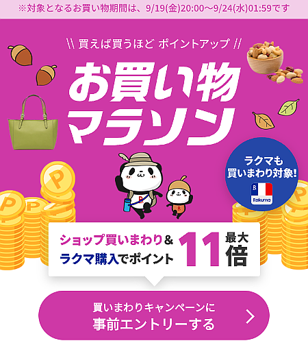 『楽天お買い物マラソン』が19日PM8時より開催されています。 今月、数えてみると、ケージ(犬小屋)やミニ冷蔵庫など15アイテム購入~ 、今回は控えめの参加予定です。「事前エントリー」は済ませています。「お買い物マラソン」のルール:購入したショップ数(1店舗:千円以上)がポイント倍率になります。 通常ポイント(個人差あり)×購入ショップ数。『楽天ポイント倍率アップ』イメージ図 対象期間:9月19日(金)20:00~9月24日(水)01:59※エントリーの受付は「お買い物マラソン」終了まで ※開催中の上記バナーは企画が終了すると別の企画に変わる場合があります。関連する記事(当ブログ)ロッテ糖質ゼロ菓子、詰め合わせセットが届く! (楽天マラソン)『楽天お買い物マラソン』の購入品「本日(21日)、購入しました。」~先着300名限定「10%OFFクーポン」を利用できます。 この10%OFFクーポンと保有している楽天ポイントを利用して3,700円で購入できました。※価格は通常価格です。※割引前価格、送料無料。【19日20時からクーポン配布中!】☆ハロウィン早割10%OFFクーポン☆【ロッ...楽天で購入楽天銀行からBIGで2025年"億万長者8名誕生!"のメールが届く楽天totoは楽天グループの楽天銀行が提供するサービスです。 楽天totoに登録(無料)して、ネットで購入、あとは待つだけ。詳細はこちら↓EZORISUの役立つ便利な情報雑学よく読まれている記事一覧を見る新着記事一覧(新しい順)を見る人気のブログはこちらランキング参加中にほんブログ村楽天カードを持つだけで、お買い物のポイント倍率UP!。カードを使うと、メールやアプリで即通知。マイページで楽天ポイントやカード利用を一括管理できます。※年会費:永年無料。ポイント受取のステップ例:特典5000ポイントの場合STEP-1楽天カードをお申し込み(オンライン)STEP-2楽天カードをお受け取り(1週間以内)新規入会特典 カード配達日頃2,000ポイントお受け取りSTEP-3楽天カード3回利用(店舗・自動引落)カード利用特典 初回決済月27日頃3,000ポイントお受け取り※楽天カード公式サイトは こちら※2回目受取は2000ポイントを引いた残りです。Ezorisu Category エゾリスのカテゴリ(目次)役立つ話題のニュース(未分類)知らされない中国の真実と報道商品レビュー&注目のアイテム期間限定!楽天市場のお得情報便利なスマホとパソコン活用術宇宙を知る!火星で見た怪映像北海道観光情報と園芸とペット健康(糖尿病 血糖値 免疫力 入院)マイナンバーカード使い方解説購入してよかったオススメ商品【...下に続きます】[広告]・当ブログのプロフィール・[広告記事]・最近の記事・よく読まれている記事・カテゴリ別記事・フリーページ(特集)。