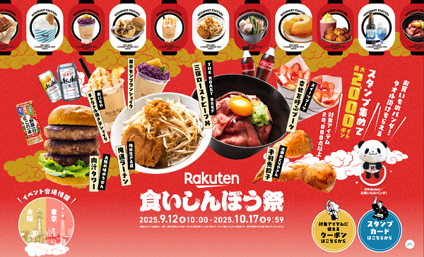 出典:Rakuten Group『楽天市場』が、ネットを食でつなげるグルメフェス「楽天食いしんぼう祭」が9月12日(金)より、大阪(扇町公園)と東京(代々木公園)で開催されます。 同時にネットでは特設ページが本日公開されました。※特設会場は下記リンクより... 会場に行けない人もネットから楽しむことが出来そうです。開催期間:2025年9月12日(金) 10:00~10月17日(金) 9:59まで楽天特設ページ『楽天食いしんぼう祭』>※リアル空間、大阪、東京会場の開催期間は異なります。大阪会場:2025年9月12日(金)~9月15日(月・祝)10:00~20:00 ※最終日は10:00~19:00東京会場:2025年10月10日(金)~10月13日(月・祝)10:00~20:00 ※最終日は10:00~19:00記事引用元:楽天グループ(株) プレスリリース PR TIMES(2025年9月12日)「楽天食いしんぼう祭」の概要「楽天市場」でグルメやスイーツを販売する約270店舗が参加、約20,000商品を紹介特設ページまたは会場で商品を購入してスタンプを貯めると「お買いものパンダ」特製グッズや「楽天ポイント」を進呈するスタンプラリー企画を実施特典: 「楽天市場」で使用できるクーポンをオンライン配布記事全文を読む(外部サイト)出典:Rakuten Group【スタンプカードへの参加方法】STEP1:特設ページ上で楽天市場へのログイン... 楽天会員登録はこちら(無料)STEP2:特設ページ上で「スタンプカードに参加する」ボタンを押し、スタンプカードへの参加に同意する。「楽天食いしんぼう祭」参加ショップの一部ご紹介「楽天食いしんぼう祭」限定コラボ商品楽天限定版 コラボ饅頭 ギフト【日本3大まんじゅう】 日本ギフト大賞受賞 一口サ...楽天で購入【楽天1位】SNSで大バズリ!百貨店で行列のできる【幸せを呼ぶブーケ】×1個(※...楽天で購入【C配送】俺の生きる道 俺道ラーメン こってり 二郎系 本格ラーメン お取り寄せ...楽天で購入漁師のまかない漬け丼の素 4種8食 海鮮丼 漬け丼 丼の具 どんぶりの具 海鮮丼...楽天で購入[ WエントリーでP最大19倍 ] \祝レビュー5,500件超/ 楽天1位 牛肉...楽天で購入EZORISUの役立つ便利な情報雑学よく読まれている記事一覧を見る新着記事一覧(新しい順)を見る人気のブログはこちらランキング参加中にほんブログ村楽天カードを持つだけで、お買い物のポイント倍率UP!。カードを使うと、メールやアプリで即通知。マイページで楽天ポイントやカード利用を一括管理できます。※年会費:永年無料。ポイント受取のステップ例:特典5000ポイントの場合STEP-1楽天カードをお申し込み(オンライン)STEP-2楽天カードをお受け取り(1週間以内)新規入会特典 カード配達日頃2,000ポイントお受け取りSTEP-3楽天カード3回利用(店舗・自動引落)カード利用特典 初回決済月27日頃3,000ポイントお受け取り※楽天カード公式サイトは こちら※2回目受取は2000ポイントを引いた残りです。Ezorisu Category エゾリスのカテゴリ(目次)役立つ話題のニュース(未分類)知らされない中国の真実と報道商品レビュー&注目のアイテム期間限定!楽天市場のお得情報便利なスマホとパソコン活用術宇宙を知る!火星で見た怪映像北海道観光情報と園芸とペット健康(糖尿病 血糖値 免疫力 入院)マイナンバーカード使い方解説購入してよかったオススメ商品【...下に続きます】[広告]・当ブログのプロフィール・[広告記事]・最近の記事・よく読まれている記事・カテゴリ別記事・フリーページ(特集)。