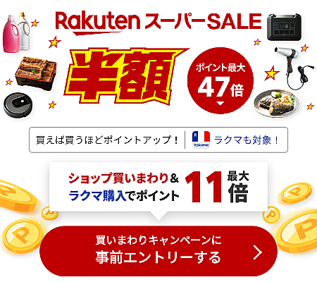 出典:楽天市場タイムセール特設ページより本日のタイムセール目玉商品は下段。「ショップ買いまわり」とは、お買い物したショップ数がポイント倍率になります。 条件は1ショップ千円以上のお買い物。 通常ポイント(個人差あり)×ショップ数=楽天ポイント『楽天ポイント倍率アップ』イメージ図 対象期間:2025年9月4日(木)20:00~9月11日(木)01:59まで エントリー:受付中!。期間内であれば購入後のエントリーでも有効になります。※開催中の上記バナーは企画が終了すると別の企画に変わる場合があります。楽天スーパーSELE 半額タイムセール2台限定販売! 倍速駆動パネル搭載で動きの速い映像もなめらか。迫力ある重低音サウンド。ソニー 液晶テレビ50型 BRAVIA 50%OFF! 販売時間:9月9日(火) 23:00~23:29画像詳細は下記リンクより。通常価格240,000円→120,000円+送料5,000円 4,237ポイント付与※個人差あり液晶テレビ ソニー 50型 BRAVIA 4Kチューナー内蔵 地上・BS・110度CSデジタル KJ-50X85K【KK9N0D18P】EZORISUの役立つ便利な情報雑学よく読まれている記事一覧を見る新着記事一覧(新しい順)を見る人気のブログはこちらランキング参加中にほんブログ村楽天カードを持つだけで、お買い物のポイント倍率UP!。カードを使うと、メールやアプリで即通知。マイページで楽天ポイントやカード利用を一括管理できます。※年会費:永年無料。ポイント受取のステップ例:特典5000ポイントの場合STEP-1楽天カードをお申し込み(オンライン)STEP-2楽天カードをお受け取り(1週間以内)新規入会特典 カード配達日頃2,000ポイントお受け取りSTEP-3楽天カード3回利用(店舗・自動引落)カード利用特典 初回決済月27日頃3,000ポイントお受け取り※楽天カード公式サイトは こちら※2回目受取は2000ポイントを引いた残りです。Ezorisu Category エゾリスのカテゴリ(目次)役立つ話題のニュース(未分類)知らされない中国の真実と報道商品レビュー&注目のアイテム期間限定!楽天市場のお得情報便利なスマホとパソコン活用術宇宙を知る!火星で見た怪映像北海道観光情報と園芸とペット健康(糖尿病 血糖値 免疫力 入院)マイナンバーカード使い方解説購入してよかったオススメ商品【...下に続きます】[広告]・当ブログのプロフィール・[広告記事]・最近の記事・よく読まれている記事・カテゴリ別記事・フリーページ(特集)。