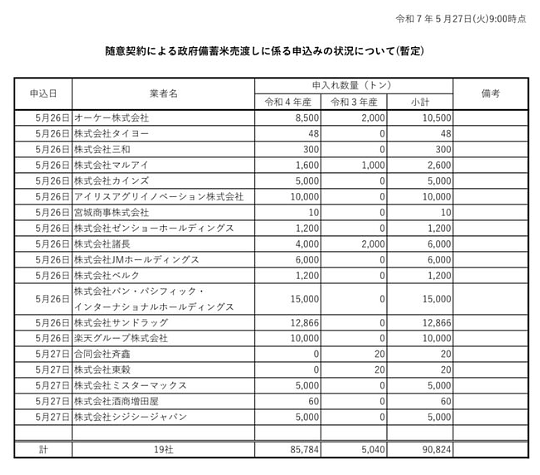政府が27日に発表した政府備蓄米放出の随意契約に申し込んだ企業は、スーパー「オーケーストア」を展開するオーケーが1万500トン、ホームセンター「カインズ」で知られるカインズが5000トン、牛丼チェーン「すき家」などを展開するゼンショーホールディングスが1200トンなどとなっている。企業名と申し込み数量は以下の通り。