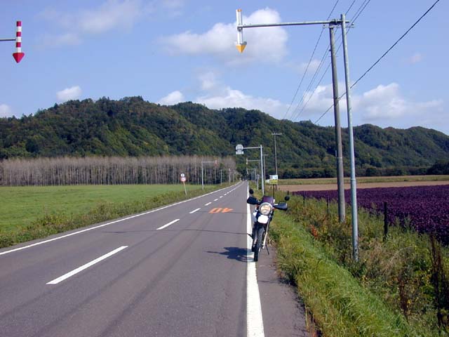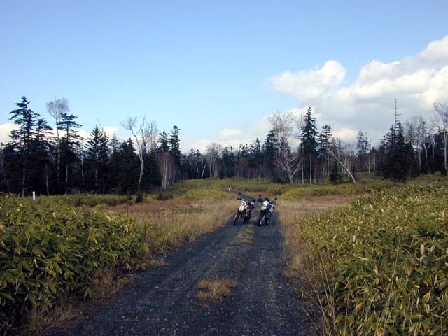 スタートから雨、、途中、良くても小雨まじりの曇天。雲は、日高山脈に阻まれ、峠上のトンネルを抜けると、様相は一変し眼下におなじみの光景。十勝平野が、朝日に明るく照らされていた。でも、目的の山はまったく見えない。そして、ベース基地の屈足は、、まだ雨、、、。だ~ったが!午前10時、「ホレホレ~!」ってな感じで予想どうりに、カイフク!広りはじめた青空に♪パンパカパ~ン♪っと、ファンファーレが鳴り響いて、心ウキウキ、そら耳もまた楽し!早朝4時過ぎ、HONDA氏がステップワゴンにバイクを押し込んで現れた。好物のジャガイモの箱を差出し、「貢もんダス、共食いして、楽しんでや、、」と、これまたソラミミだったか?小雨が降ったり止んだりする中、ハイエースにバイクを移し荷物を放り込み、オッサン二人とバイク2台の入った貨物車は、「本来7時から11時まで営業のはずなのに24時間やっている、よろず食品チェーン店」へ。朝食とパワードリンクを仕入れ、5時、初の同伴トランポ開始。本日のミッションは、520円の「ゼナ」というパワーサプライの暗示力にあやかり、肉体はバリバリのつもり、、、寝不足のアクビを、、気合で噛み殺す。動脈硬化率は、ギリギリだけど、まだ、一応は、、標準値内、、のはず、、。朝の発奮は危険と聞くので、作動油の急激な圧力上昇を避け、なるべく力まない様にアクセルを踏む。いざ!、トムラウシのフトコロへ!、、ブッブ~。オフロード走行フィニッシュ予定のペンケニコロベツ林道の里側の出入り口は、ベースにする屈足温泉のある公園のすぐぞば。走り終われば風呂へポッチャ~ンとイケル。しかも、パンケニコロベツ林道の出入り口までわずか数キロ、という、とってもステキ組み合わせ。さらに、奥にはヌプン温泉、途中にトムラウシ温泉があるので、走りもさることながら、やりようによって楽しみの多いステージなのです。まずは、両方の入り口を見て廻り、クローズされていなことを確認。午前9時、公園に車を止め、雨が止むのを待つ。ここは、ダム湖に併設された広いきれいな公園。敷地内のパークゴルフ場以外は、時期のせいか?淋しい。昨年も使わせてもらったこの駐車スペースらしきところは、今年もヒト気が無く、まるで貸切。「絶対に晴れるはずだ」という予測の上、すでに清水や帯広方面は晴れたけれど、このあたりから山にかけては、なかなか回復しない。時間が掛かるのかもしれないので、場合によっては雨中でのスタートも、やむを得ないと覚悟。しかし、山でガスっては困る。そこで、このまま車で道々718で奥の様子を見に行くことにした。林道出口まで、岩松湖、東大雪湖を経て、十勝川を遡り、40キロ弱のドライブコースを往復する。走るにつれ、雨が止み山の姿が見え始め、やがて雲が切れ青空が顔を出し始める。ガスの心配どころか、ドンドン急速に回復しはじめる。そして、ベースへ戻ってきた時には完全に「晴れ」。どうやら、ヌプンまで行けそう。ウキウキ、ニタニタ、、と、準備して、11時17分、パンケニコロベツ林道へ、突入!↑の写真は、上げた高度を一旦下げ、沢沿いへ下がって谷底を渡るヘアピンカーブ。この林道特有の締まった路面で、雨上がりでも走りやすい。最大の特徴である見通しの良いリズミカルなコーナーが、奥十勝峠まで快適に続く。その状況に、シビれて、、HONDAさんがフォ~!っと、そのまま、、コウチョク!、、、パッキ~ン。その後、再び高度を上げ、木々が葉を落とし荒涼とした山肌が、綿雲を少し抱いた青空を引き立てる。空も広さを増して、峠上が近いことを予感させるカットです。 峠上は、高原を走る心地よい雰囲気で、簡単に通り過ぎるのがもったいない。支線へ入り、カンバ類の白と緑の松が混じるロケーションを楽しみます。 緑が濃い時期と比べると、かなり見劣りするものの、好天と、それによる気持ちの明るさで、こういう時ってのは、ゼーンブ良く見えるんです。道は間もなくペンケニコロベツ林道とシートカチ林道との三叉分岐に出くわし、同時に「奥十峠」の表示を確認できます。シートカチ林道へとクラッチを繋ぐと、緩やかに下るストレートが、十勝岳連峰へ突き刺さるビューポイントに差し掛かります。2~3箇所ほどのカメラポイントを確認しつつ、撮影は帰りにするとして、グッと速度を落としトコトコと景観を堪能。ここで、十勝岳の直下を廻るレイクサベツ林道を経由することもできますが、景観も特に無く、狭い荒れ気味の消化的コース、というのが前回の印象。熊の出没も多いらしいので、今回は最初から予定しませんでした。 そんなわけで、15kmほどシートカチ林道を下って道々718へ、ホッとする間もなく数十メートルで、ヌプントムラウシ林道へ入ります。そしてここで、「自然災害により露天風呂は使えません。」との看板あり。アチョ!ガッカリ、、、ですが言うまでもなく、ゴーグル越しに、「んならばその様子、見にいくべか~」と眼力通信