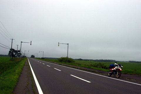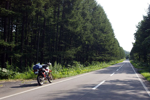 <2日目>虫類ナウマン公園キャンプ場 ~ 別海ふれあい公園キャンプ場本日も晴天!、気持ちの良いアッサー!暑くなるらしいので、涼しいうちに撤収作業を済ませて走り出したい。小ぶりなライ麦食パン4枚に、ソーセージをケチャップで味付けして挟み、フランクフルト風サンドイッチ(?)と野菜ジュースでパパッと朝チャージ完了。けっこうトマトが好きで、ケチャッパーなのであります^^異常発生と聞くマイマイ蛾が、芝の所々にへばりついてジタバタしている。昨日は見かけなかったのだが、どうやら夜は灯りの周りを飛び回り、産卵後に最後を迎える、その様子らしい。振り分けバッグを取り付け、その他諸々やっている少しの間に、バッグに、できの悪い黄な粉菓子の様なマイマイ蛾の卵を産みつけられた。燐粉が肌に付けばタダレルとも聞くし、コレがけっこう気持ち悪い(^^!この油断も隙もないところなど、この蛾の特徴らしい。夜のうちにキャンプ場入りしたらしいバイクが増えている。アイデアたっぷりに作りこんだTT250R氏とも残念ながら挨拶程度で、8時過ぎ、ボチボチと出動する皆に続き、お楽しみ2日目のはじまり~。旅先、晴天の朝の駆け出し。その清清しさは、いつもたまらない、、美味しいですよね~^^森への小道をみつけてエンジンを止める。ヘルメットとジャケットを脱ぎ、森の中へ少し歩き出してみると、アン・・ナマラ、キモチイイコト♪朝日に暖められた草木の香りと土の香りが、やたらと良い。フィトンチッドとやらも混ざってるんでしょうかね? ホロカヤントーへと続く朝のR391は静かな道でした。すれ違う車が殆ど無い、そのテネレ専用道路から、たった数十メートルの距離なのに、ほんの数秒の距離なのに、まったく別の世界から振り返って観ているかの様。まさか、、幽体離脱?、、、なんちゃって^^!クラッシュしてないし・・・足、、あるし・・・。そんな気分にもなる、そんな楽しい、これも、ささやかなバイウェイツーリング~、、、っちゅことで・・。----------------------------------------------------------------この周辺、主要国道R336の太平洋側には、湧洞湖の他に、複数の沼が点在していて、地図上では湿原も見える。その湿原への道筋も見当たるので、R881の道端で手招きするダートを、ノンビリと散策してみる。恍惚として、、つまりはボーっと突っ立ってる様ですが、まるで予定していたみたいに、目前に一羽の鶴さんが飛来。真っ白く大きな羽を広げてアプローチ、草原を舐めるようなグライディングで、フワン、、とフレアーを効かせて見事なランディング。舞い降りました、一羽の鶴が・・・嗚呼、その姿の美しいこと。かつて鶴居村を通過中に、その美しい姿を拝ませて頂いた。家族で見たステキな思い出だったので、今回も鶴居村周辺で鶴さんの姿をば、、と目論んでいたのです。この好天と幸運なオマケで、程よく興奮、、思わずニタリとなる。少し距離があって、鶴様各位のお顔の特徴までは拝見できなかったけれど、やっぱり、いいですな~、ナマ鶴様のお姿は・・。(鶴さん当てクイズ、、、、一羽いらっしゃるのです、、サテ ドッコダw)ちっちゃすぎる。と他へ視線を振り回したり、雑草に肥やしをくれたりしていると、分身の術、、、そうきたか・・・よく見りゃ、ほんとに三羽で、三角関係?一羽をめぐる攻防?争奪?もしくは、繁殖行為に及ぶのか?ところが期待に反し、さしたるアクションもなく静かに時間が過ぎる。カメラを構えて固まることしばし、、呼吸が窮屈で、汗が噴出し、手が震えだし・・・根性つきて、ハァ~、、っと大きく息をして手を下ろしたりしたもんで、、そういう時に限って、急に飛ぶもんなー!! ( ̄ε ̄;)あわてたし、遠いし、ヘタだし、拡大してみたら、ホレ、やっぱりブレてたし!ツルさんツルさん、、、幸運な一声ちょうだいな!神頼み、、鶴頼み。なんでもいい、こじつけでもいいんです、、拝みたくなる今日この頃・・・。 ----------------------------------------------------------------R336 の出来損ない 昆布刈石の道は2度目。今回は、、なんも見えず・・・頭の上で太陽がボンヤリとあるだけ、晴天なのに霧。暑い日なのにヒンヤリヒヤヒヤで、見えないのに明るい、、不思議な感じ。楽しくはないけど、気の持ち様では、、「キャ~!幻想的ですてき~!」良きに解釈、、前向きに、ポジティブに、、建設的に、、、あとはなんでしょ?ダメ押し、、、ツーリングばんざい・・・^^!(厚岸 R44のバイウェイ もんしず にて)しばらくぶりに降臨されました、、山ポンの神様、オニギリ大明神!昼飯ついでに、奉納の儀 ヘンなオドリはありませんw大自然に感謝! カシコミカシコミ・・・も~すぅ~・・ナムナムナム・・・(R142 霧多布湿原 琵琶瀬)海からの霧がバラけながら流れ、景観にカスミをかける。そこそこ綺麗に見えるけど、焦らされてるみたい。(厚岸 糸魚沢林道15.5km R44→R123へパス 南進) 糸魚沢から、お目当ての林道郡へ入り込んでみると、幹的な存在である糸魚沢林道か