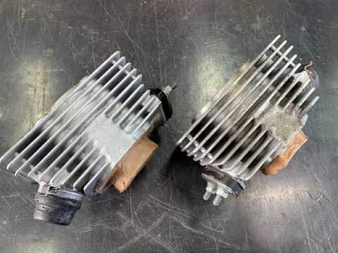 エンジンは分解せずに、そのままの姿でウエットブラストを施した後、シリンダーを外して、吹き残し部分を再度ブラストして綺麗に仕上げておきます。シリンダーとピストンは、ほぼ摩耗無し。ピストンをウエットブラストでクリーニングして、ピストンリングのみ新品に交換。オリジナルの写真にならい、両サイドのケース&カバーはバフ研摩して、耐熱のクリアーで仕上げ。ハブ等のアルミ部品もウエットブラストの後にバフ研摩。こちらの仕上げはウレタンのクリアー塗装。小物部品も含めクロームメッキ及びユニクロメッキは全て再メッキ。再メッキ済みのリムにステンレスのスポークで、ビッカビカになりましたね。ロックした様に僅か2cm程したストロークしないフロントフォークを分解すると、中から出て来たのは、複数の細切れスプリング、(゚Д゚;)!見たところ、これは四輪のエンジンのバルブスプリングwしかもストロークする摺動部に入っていたので動くわけありませんね。しかもアウターチューブの底にガッチリとハマり込んだスプリングを抜くに一苦労。引っ張り出す金具を三度作り直しながら数日かけて、やっと取り切れたしだい。何処の何方がどんな考えで組んだのか、酷いもんです。なんとか中古のフロントフォークを海外サイトから見つけ出して、スプリングを調達。錆と傷のあったインナーチューブは、例によってハードクロームメッキで、アウターチューブとその他は普通のクロームメッキ。アルミのアッパーブラケットはバフ掛けにウレタンクリアー。フレームもウレタン塗装で綺麗に出来上がり。汗と根性の工程がやっと終わり、これでやっと、楽しい総組立に入れます。