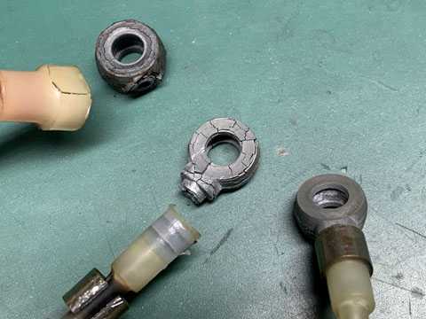 いわゆる、バンジョウ(ボルト)コネクターですが、経年変化でボロボロ・・ねじって外そうとすると、簡単にポロリとなw(^^!僅かに寸法の違う二種類があって、形を維持しているモノとそうじゃないモノがり、同じ条件下にあったわけなので、全部ボロボロになっていてよさそうなもんですが、この差は何からくるんでしょうね?ともあれ、海外にある中古品は全て高額なので、真鍮の丸棒から削り出します。製作手順は何通りか考えられ、いろいろ試します。手始めはネジ部から・・オイルの通り道を開けて、基本的な手動で球体を削り出して、その先へ進みます。ボルト穴の内面はオイルを流す隙間が必要なので、奥まったところで内径を拡張。しかし、精度の良い小さい内径バイトは持っていないので作らなければなりません。チト めんどうなので、この際奮発して6ΦのTスロットカッターを利用。突っ切って、切り口を整え、出来上がり。ですが、複数作るとなると、球体の削り出しを同じ精度で下げる腕は無いので、自家製の円弧カッター登場です。厚さの違う二種類で数個できあがり。エンジンに取付る際にネジロック剤を塗布するので、それまでは固定せずに保管。鉄製のパイプでカシメの様に補強されているところは、樹脂パイプの割れ防止なので、きつめにハマる真鍮パイプで代用します。コネクター付き樹脂パイプ、この部品とても希少で国内では見つかりませんでした。海外サイトで幾つか心配な外観のモノがありますが、運賃を含めると2万円以上(^^!コネクター劣化の程は、いざ知れず、なので怖くて買えません。イザとなれば、金属パイプで製作、さすれば作るのもむしろ簡単だとは思います。でも、やはりオイルや気泡の流れは、透けて見えるに越したことはありませんよね。スケスケが好きなのは、ワダスダケデショウカァ・・