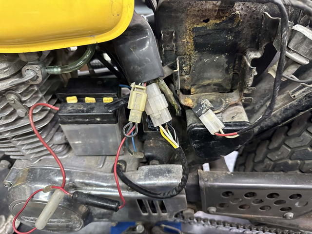 これまでの12v化は、特に問題もなく稼働していたものの、ボアアップでの公道デビューを急ぎ、最低限のハーネス弄りで施した12v化でした。ゆえに、無駄な配線も残っていたりで、整理しなおすべき状態。おまけに、過去の「12v化」の記事に間違い写真を使ってしまっていたこともあり、その後の進展をも含め、記録を記事にしておきます。まずは、6V仕様だった着手前の写真レクチファイアの取り付け位置の都合で、白と赤の2本延長線で離れて繋がってました。左の4極カプラはエンジンのジェネレーターからで、12v化で弄るのは、交流出力の 白 と 黄この、ジェネレーターからの、交流出力の 白 と 黄 をレギュレーターの 交流入力 白&黄 へ接続。黄 は、ライト/テール用なので、そのままでも、分岐して繋いでもOK(発電量が少し低め)ただし、ライト/テールは交流のままになるので、エンジン回転数に依存して明るさが増減。今回の作業では、後ほどライトスイッチで、ライトON/OFF出来る様に細工します。ここで、紛らわしくも余計な線を整理。あらためて、文字や絵にしようとすると、ゴチャゴチャして分かりにくいですね、、、(-_-;)分かってしまえば、簡単な改造なんですけどね。レクチファイアが元々付いていた位置まで不自然に伸びている 白 と赤 の線を撤去。ハーネステープを解いてみると 白 は4極カプラの 白 から繋がり、赤 はメインハーネス内で合流。レギュレーター4極カプラの各線を、ジェネレーターからの4極カプラ付近までの長さに作り、各線ギボシ端子で接続。だいぶスッキリいしたしました (^^で、今回は、ライト/テールも DC12V 化して、キースイッチ ON の時に、ライトスイッチで ON/OFF 出来る様にします。そうすることで、バッテリーからのDC12Vで点灯し、エンジン回転数に左右されなくなります。(1)本来ライトスイッチ入力に繋がるメインハーネス内の 黄 を切り離す。(2)そのライトスイッチの入力線(黄)を、キー ON でDC12V が出力される線に合流させる。(3)メーター下に取りけられた、ライト回路のレジスターの線を外す。交流ライトの為の装備らしく、これを殺さないと余計な電気を消費。キースイッチON、エンジン始動しなくても、ライトスイッチONで、ライト点灯を確認。その他灯火類の動作を確認、更にエンジン始動して同じ内容の確認。これで、ライトのDC12V化の作業が終了。最後に、バッテリーへのチャージ電圧の確認。まずは、作業前にエンジン始動前の冷え切った状態で測っておいたバッテリー端子電圧。エンジンを始動、暖機運転が終わってアイドリングが落ち着いた状態。アイドリングでも、弱いながらチャージありで、僅かに電圧上昇。エンジン回転数 1700 rpm2000~3000 rpmそれ以上は、ブン回しても僅かに上がるだけ。とまあ、レギュレーターの電圧制御ぶりが感じられるし、14.5vまで上がるので充分かと。さて、実は最後に肝心な測定が控えておりまして、ライトONでは、、どうーなるか?理路整然とした根拠など無く、けっこういい加減な自分の予測は、「ギリギリ実用レベルで、なんとかいけんじゃないの?」てなもんでした。が、、測ってみて、、撃沈!ここまでの測定中に、ある程度充電されたので、アイドリングでもバッテリーは13~13.5Vここで、ライトスイッチON!瞬時に、、12.0Vまで降下、、いや、、どんどん降下 11.9、8、7、・・・ (-_-;)エンジン回転を 2000~3000rpm 程度上げると、徐々に上がって12.0~12.3vあたりまで復帰。しかし、それ以上回転数を上げても12.5v程度が精いっぱいな感じ。ライトON では、ギリギリのチャージしかできず、余裕がまったくありましぇんwアイドリングなんかしてたらバッテリーが上がりそうになるわけで、フラマグ点火だから、なんとかなるべーって気もするけど、これじゃ、殆どしない夜間走行とは言え、止む無く至ってしまった際は少し怖い。ともあれ、暗いライトでのトンネル通過の恐怖が解決されそうなだけでも、進展あり。あとは、やはり、全波整流化、、するか? しないか?さあ、どーする・・CDI 化の準備が進んでいるので、ココは、しなくてもいいや、、って気もするんですが・・さて、どうする~・・と、迷いながら、トンネルなど暗闇の無い、一応昼間のテスト走行してきましたとさw本日午後、路面が乾き、晴れてくるとの予報だったので出動。札幌曇り当別青山、厚田山道は、晴天。厚田から札幌は、曇りいつもの100㎞コースは、総じて寒し (-_-;)特に何もなく、、電装改造後の「異状がないかどうか点検走行」でした。