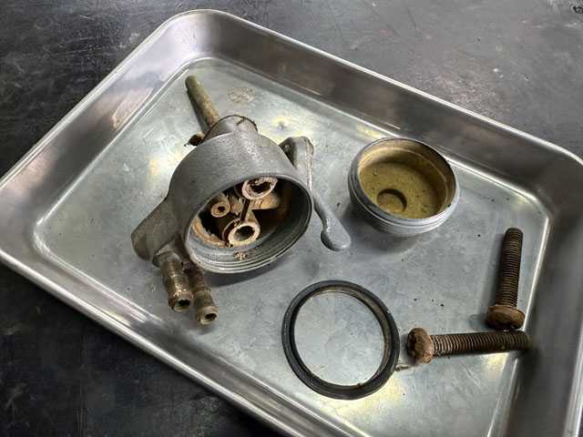燃料タンクを仕上げるべく、汚れが酷くて気になっていた燃料コックに着手。奥まった部分やトンネル内部のクリーニング、そしてバルブパッキンの入手でいつも厄介なコレ。過去のレストアを思い返せば、小さいながら、けっこうな手間と時間を費やしたことが多い。汚れの下の腐食層をも取り除かないと後々面倒なことになるので、ケミカル漬け数日にはじまり、じっくり時間をかけます。数日間の漬け置きや細かい作業を経て、なんとか腐食による重大な欠損が無い事が判明。数日後、内部まで綺麗サッパリとしたところで、おまけのフィルター付けます。ガソリンの流入パイプに真ちゅうの円筒形フィルターを作って増設。バルブ(パッキン)と取り付け部のガスケットが、終了部品でなかったことは幸い。本来あるべきフィルターネットが無く、これは純正部品としても販売終了。入口にフィルターを付けたので無くてもいいのですが、あって困るものでもないので作ります。これで、細かい部品の再生が全て終了。