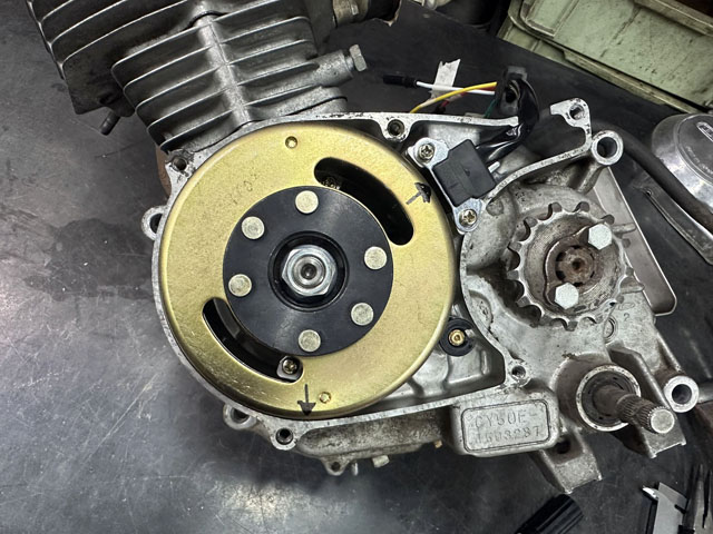 外したオリジナルのフライホイールのタイミングマーク(刻印)を基にして、CDI 用のフライホイールでのタイミングポイントを探ります。もともとあったタイミングポインター(突起)は削って撤去。新しいポインター (6Φ) を作ります。大きさはあまり厳密ではなく、もともと 6Φ だったから、という理由。多少違っても問題ないはず。要は、パルサーコイルの磁気鉄心と接触することなく、一定のギャップで通過すればよし。その瞬間、コイル内で電磁誘導が起こって、一瞬の発電が電気信号(パルス)になればいいはず。厳密には、各位置関係に理想的な数値があるんでしょうけれど、経験的大体寸法でいきます。フライホイールのマグネットは過度な加熱が禁物ゆえ、手早く溶接を済ませなければいけません。けれどポインターは小さいので、TIG 溶接とは言えゴテっとヘタッピな肉盛りになりまして (-_-;)整形してるうちに四角になりましたw周辺の焼け焦げやら擦り傷は、ジンクリッチで隠しておきましたwポインターとパルサーコイルのすれ違いで、横へ突起幅半分程のズレあり、だけど問題ないはず。二度目の発注の際、フライホイールなしの CDI 部品セットを購入しので付属の補器類の出番。簡易的に接続して、軽くキックアームでクランクして、スパーク発生!思わず声が出てしまう「ヨ~シ!ヨシヨシ・・」早速、エンジンを外した R&P オレンジの車体に載せて、キック!まるで、オリジナルのフラマグのままで何もしてないかのごとくに、調子よく始動!この時点で変化が分からなくても当たり前という気もするんですが、じみ~な達成感り。タイミングライトで点火時期を確認すると、CDI ユニットは進角なしであることが判明。ストロボが照らし出すタイミングは、ちょうど進角が欲しいと感じる角度あたり。ゆえに、にケッチンを感じることもあり、ですがアイドリングから高速まで安定してるので、差し当たりこれでヨシとします。オシオシ、早速に、R&P 黄色 に組み付けて走ってみるべしと、ワクワクしながらジェネレーターを移植。ついでに、ちょっと気になる部分の関係が否定できないので、手直ししておきます。僅かに干渉していたクランクケース側の出っ張りを削除。無事に、別車体への移植を済ませ、エンジン始動、、調子よさげで安心。さて、公道での試運転はいかに・・