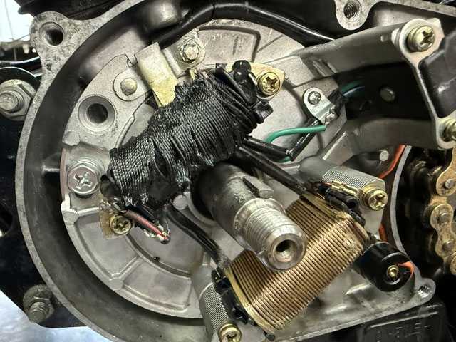 近所を調子よく走り回り、、、7km 走って、エンスト・・なんと、、エキサイターコイル焼損!再度ハーネスの整理、ジェネレーター各部の調整、予備部品のコイルと交換して再度走行。やっぱり7km 走って、エンスト、、、またもコイル焼損!哀れ、、エキサイターコイル・・何かが間違ってる?何度見直しても、、原因不明・・と言うことで、CDI 化は、暫く頓挫となりそう・・残念!!となれば A 型 R&P (黄)は、もとのオリジナルのフラマグにもどして、使えるバイクとして温存。J型 R&P (オレンジ)の車体にて、もしくは、エンジンスタンドでか、じっくりやろうじゃないか。コイル焼け、、見た目のもショッキングなこの失態、、ムムム・・心燃ゆ、、 p(-_-)q
