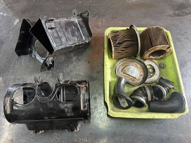 紙製のフィルターエレメントはボロボロで使用不可。金物部分だけ採取して再利用なのですが、紙製のものは紙自体の強度と薄い金網で自立。作り直しはスポンジをエレメントに使うので、金物部品が全て連結して自立する強度が必要。なので、エレメントを保持するコア部分は、ある程度の硬さを持つ金網を使用。丸穴が沢山空いたパンチングプレートが欲しかったけれど、少量の入手が面倒なので今回は金網。各部材はサンドブラストでクリーニングして、接続ははハンダで充分。形になったら、金物部分の錆止めと美観として、ユニクロメッキをしたいところですが、サイドカバーで隠れるので、今回はウレタンのクリアでのカバーリングでした。フレームが出来たところで、エアフィルター用ウレタンスポンジで、エレメントを制作。スポンジの接着は、セメダインUT110エアクリーナーケースとの接触部に機密保持のために、発泡ラバーでパッキンを作って接着。使った接着剤はアロンアルファEXTRA。取り付け時には、フィルタースポンジにワコーズのエアフィルター用オイルを使用。本体に取り付けて、出来上がり。