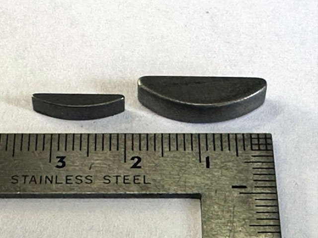 小さいのが、 R&P オリジナルの ウッドラフキー(半月キー)厚み 3mm大きいのは、CDI 用フライホイールのキー溝 4mm に合う厚みで、かつ円弧が同じモノ。テーパーボスなのでガッチリ締めこまれれば、キーにかかる剪断応力は皆無。このキーの主な役目は、取り付けの際の位置決めが主で、万が一嵌め合いが緩んだとしたら、わりと簡単にブッチ切れ(剪断)ます。でも、外すのにフライホイールプーラーを使うくらいなので、簡単には緩まないもんです。細かい理屈をこねれば、緩み止めの役割も少しは担っている、と言えないことも、なし、かな。クランクシャフトのキーが切れた修理も沢山弄ってきたので、邪道とも言える策が浮かびます。極端な話、フライホイールの 4mm 溝と3mm のキーの隙間にテーパーキーを作って叩き込めば、それでもオッケーなわけです。テーパーキーで軸にプーリーなどが固定されているのを見ることは、ほぼ無くなりましたけど・・フライホイールに、新たに3mm のキー溝を切るのが順当かもしれないけれど、道具がなし。どっちみちパルスポインターの移設が必要だし、キー位置を同じにしてサイズを合わせればよし。となれば、単純な発想で、両方のキー溝に合うキーを作ればいい、ということで、削りました。極たまにしか使わない精密バイスの出番でした。アダプテット・キー? 変則ウッドラフキー? それとも段付き半月キー?なんて言えばいいのか、、(^^!クランクシャフトの半月溝に取り付けてみると、はい~、けっこうバケた感じしますねwまるで、キー溝がもともと 4mm みたいに見えちゃいますよ(^^)フライホイールを取り付け、ナットを締めこんで、念の為にプーラーで抜いてみて手応えを確認。いい感じに収まり、、ウシウシつぎは、ポインターの移設なり。
