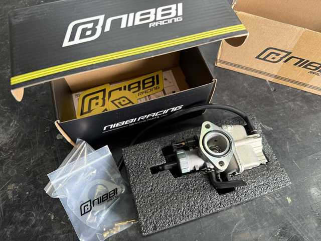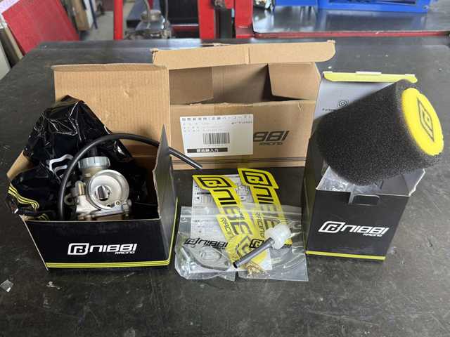 R&P 用に仕入れてあった NBBI のキャブレター。エアクリーナーとセットのタイプで、型式はPE19。使用中の PC20モドキ よりも取付部の口径が大きい。黒塗りのモノが売れてるようですが、塗りなしの方が好きだし安価なのです。本来ならば、インマニの口径をキャブに合わせ、エンジンのポートも相応に削りたいところ。しかし、スペースの関係でポン付け出来る既製のインマニがないので製作となる。その為の治具を作ってはいるけれど、まだ製作に使う材料などの検討中でいつになるやら・・なので、キャプ取付側の穴を削って口径を合わせるだけで走ってみよう、となった次第。もともと付いていたエアクリーナーは、取り外して付属のフィルターを取付。サイドカバーもギリギリセーフで、特に問題無く取付可能。エンジンを始動してみると、空吹かしだけでも明らかな違いを感じ、ワクワクする感触。セッティングはデフォルトのままだけれど、概ねレスポンスよく軽快に吹け上がる。夜なべ作業だったので、翌日いつもの100㎞ コースへ出動。駆け出しから見事な変化!低速域の燃調が少し濃い感じを受けるものの、回転域全体に明らかなパワーアップ!吹けが早く、総じて軽快なフィーリングに変化している。インマニの段差を綺麗に削ったとは言え、交換するだけでパワーアップする、というウワサは頷ける。他のキャブレター、TM24 等も取り付けてみて比較した訳ではないので、一概に NIBBI だからとは言い切れないけれど、ウワサが間違いだということにはならないはず。「この値段でこの品質と変化」ここが重要だと考えるしだい。確かに1速~5速各シフトでの最高速も上り、軽快なフィーリングにで気分よし(^^)ついついスロットルワークが荒くなって開け気味。そのせいもあり燃費 33km/ℓ と過去最悪の結果。その点は、走り方もさることながら、キャブ口径によるところが一番の理由だとは思う。走りが軽快になりヨロシイとは言え、デフォルトのセッティングがドンピシャとは思えない。そもそもこのキャブレターの対象排気量は100cc~125cc なので、82cc には正解なはずがない。実は、低速域で少々モタツキ感があり、全体に燃調が濃い感じは気になるところ。ありがたいことに、メインジェットと4個とスローパイロットジェット1個が付属するので、付属品内でもっとも薄くなる様、スローもメイン共にジェットを交換し、ニードルも一段変更。<付属品>メインジェット :100 95 92 (デフォルト 98 → 92)パイロットジェット:30(デフォルト 32 → 30)ニードルバルブ :デフォルト 4 → 3すると、これまた見事な変化!アイドリングから全開まで、更なるパワー感!かつ実にスムーズ。最高速度も4速と5速で、それぞれ約10 ㎞/h アップ!これがドンピシャのセッティングじゃないとしたら更に楽しみな限りだけれど、キャブセッティングに関してはもうこれで充分でしょう!、、と思いたくもなっている。出直して燃費測定: 53㎞ / 1.2ℓ=44km/ℓ※※スロットル開度に気を付けて60~70㎞/h※信号の少ない郊外を中心に走行※4速5速にて最高速テスト各1回この NIBI PE19(100~125cc) は最小の一つ前に型式で、その下にPE17(100~110cc) というのがある。125cc に使うことも想定しての PE19 購入だったけれど 、ここで迷いが・・PE17 の方が、よりツーリング向きで自分好みに近づけるのでは?今回の PE19 は、125にて再度試すとして・・PE17、ポチリました、トサ。