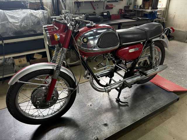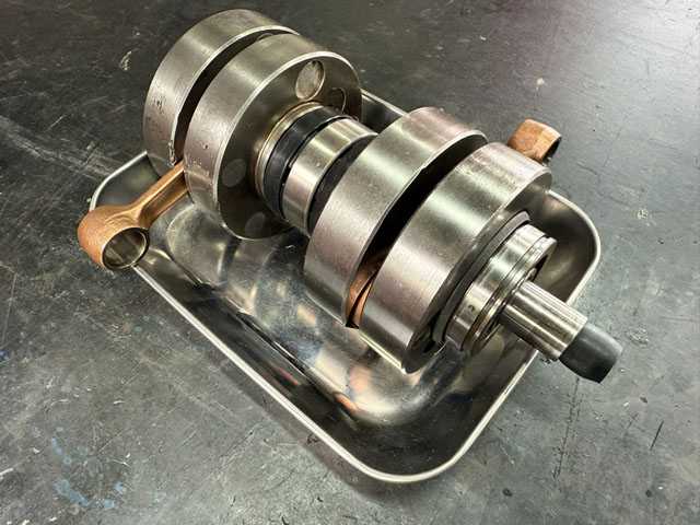 外注先からクランクシャフトが、リフレッシュされて帰還。まずは、クランクケースへの仮組で諸々の確認。実はこの T20 は、クラッチケーブルの取り付けが構造的に厄介。レリーズアームを組付け済みのクランクケースカバーを、クランクケースに取り付けてしまうと、ケーブルが取付できません。ケーブルを組付け済みで取り付けるか、レリーズアームを後でケーブルと一緒に取り付けるか、という選択になるのですが、後着けは誤って小物部品を内部に落とすリスクを伴うので、ケースにケーブルを取付けた状態での組付けが安心だし、作業がし易い。で、持ち込んでもらったケーブルを見ますれば、、あら?、形状違い。受け取った時の確認不足でした、、(^^;部品番号が正しくても、年式違い等でよくあること。この場合、物理的にマイナス部分が無いので、余計な部分をさっさと削って、はい出来上がり。古さから来る細かな修正等をチマチマと加え、新しい世代の腐食等が無いエンジンにくらべ、倍以上の時間がかかることは珍しくなく、今回もしかり。ともあれ組立完了。仕上げに、アルミの白錆防止に、クリアーでカバーリングして終了。ちなみに、シリンダーは耐熱塗料で、それ以外はウレタン。車体に載せ、火が入って、順調に事が進んでほしいところですが、さてどうなるか?まずは一段落。