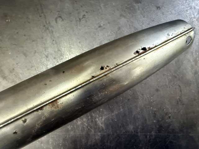マフラーは、全体にメッキの劣化や擦れが多く、腐食が大きいことも判明。錆と思って触るとポロリと穴が開く始末。よくあるヤツですが、こうなるとその数倍は薄々な箇所が潜在するわけで広範囲の補修が必要。そして再メッキとなるわけで、けっこうな出費。ここでオーナー氏が代りの中古マフラーを持ち込み。が、しかし、年式違いなのか?輸出先違いなのか? エキパイが一体型な上に微妙な形状違い。かつ両方にエキパイ部分に凹みがあり、全長方向に歪あり。おそらく、バイクに取付いた状態で何かにブツケたんでしょうね。おまけに、左ステップも干渉いて取付の邪魔。ステップ自体も溶接して加工した痕跡があるので、どっちが本当なのか?不明。というわけで、干渉部分あり、歪んでボルト穴が合わないってんで、取り付けが出来ず。この際、止むを得ずということで荒療治のお許しが出まして、ガリゴリ!のトンテンカン!何とか取付のが可能、、、ですがまだ、ステップを切断して改造が必要。そして更なる問題は、2ストあるあるで、マフラー内部のベトベトな汚れが、著しい (・_・;)バッフルパイプの入る中心のトンネルが細いタイプで、これまた厄介。いつも使っている高圧洗浄機のノズルが入りません、、(-_-;)こういう時は、それなりにノズルアタッチメントを作って対処するとして、作業手順を変更。取っ掛かりにやる予洗浄をガソリンの漬け込みにして、大まかな油汚れを溶かします。これを、今回は5日間放置。頃合いを見てドバーっと出してみますれば、、堆積していたカーボンも石炭屑のごとく排出。洗浄機のホースを突っ込んですすぐと、こんな汚れが沢山。実際に出てきたドロドロの量は写真の数倍。これで、油のベトベトや、取れやすいゴテゴテ汚れは取れたわけですが、これはまだ第一段階。これからが肝心な落ちにくいコビリツキカーボンを出来るだけ除去すべし!いつもやるのは工業用洗剤に漬け込み。月日をかけたレストアなら数週間~数か月、何度か洗剤を入れ替えて綺麗にするわけですが、そうもいかないので、海外手配中のスプロケットが入荷するまで。もしくは、様子を見てソコソコの状態になったら終了予定。次は本体に取り付け、現物合わせでステップの改造をしなければなりません。2ストの場合、煙モクモクなのは、マフラーに溜まった未燃オイルが排気ガスの熱で再加熱され、モクモクなのが半分か、場合によってはそれが以上とも言えます。ガンガン回して燃やして公道を走ることが少ないので、なお更ですよね。それに気がつかずに、単に分離給油のオイルが燃えた煙だけ、と思っちゃいけません。煙の元がドンドン溜まっていくんですよね。で、自分の身体にも、、なんか悪いもモンが溜まってきてるような・・(-_-;)