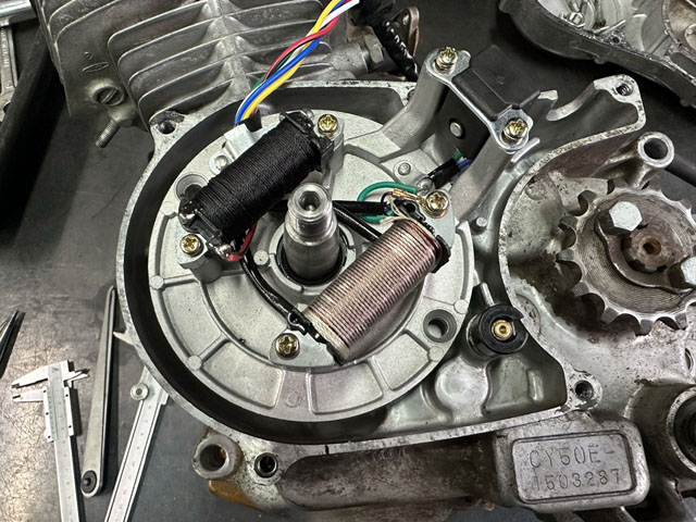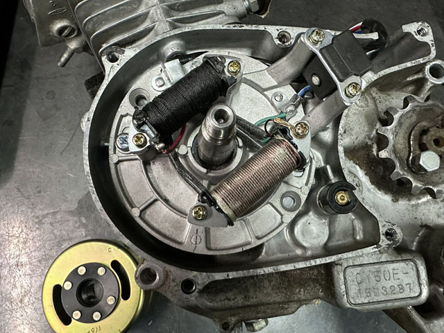 キー溝を合わせ、点火タイミングが取れるステーターの位置を探すと、パルサーコイルの位置が、