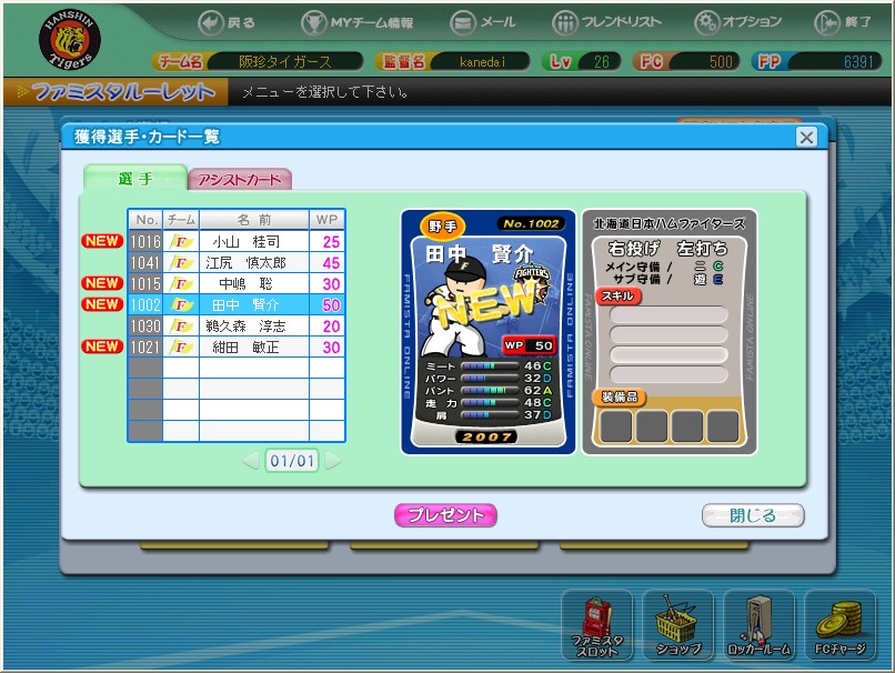 今日のアップデータで各球団ルレが出たので、未所持が多いパリーグのか未所持が少ないセリーグを回すのか迷ったけどファイターズにしたら、1000FCあったのに500FCずつまわしてしまった><。1回損した。でも未所持が出たので良かった。1回目出た瞬間イスから落ちそうになりました。なぜかというのは下の方で・・・。2回目こちらもビックリ仰天。2枚フレにプレゼントした後なのですが、吉川が2枚ありました。自分で合成しようか迷ったんですがフレプレにしました。1回目も2回目も、今日テストだったわけで(←勉強しろよ!)、50分間なんですけど、余ったんですよ~。それでファミスタのこと考えてて、今日帰ったら「パルレ回したら稀哲SPや賢介SPでないかなー」とか思ってたわけですよ、外野はまだしも2塁が片岡ぐらいしかいないもので、ほしかったんですよね。SPでは無かったものの稀哲、賢介がNであっても出てくれただけうれしい。 長文に付き合って頂きありがとうございます。 ~~~~~~~~~~memo~~~~~~~~~~F 森本・田中・小山・中嶋・紺田・坪井・陽E 佐藤Sh 江川Fの選手はルーレットにてGet。それ以外は、スロットにてGet。