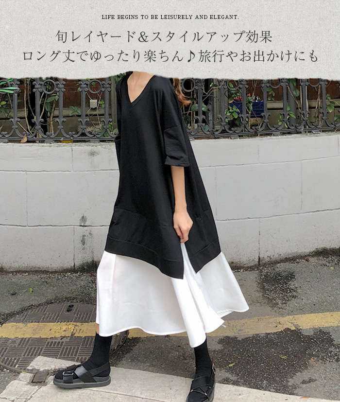 重ね着風の異素材切り替えがユニークなワンピース!首元はVネックでスッキリと、ゆったりとしたオーバーシルエットで気になるボディラインも優しくカバーしてくれます。締め付けのない着心地の良さも嬉しいポイント。1枚でさらりとシンプルに着るのはもちろん、手持ちの小物でスタイリングするのももおすすめです☆即納 ロングワンピース 切り替えワンピース 春 秋 夏 半袖 きれいめ レディース ワンピ 重ね着風 膝丈 ロング丈 ミモレ 大人 可愛い 通勤 普段着 OL カジュアル トレンド 着痩せ おしゃれ 送料無料価格:2,680円(税込、送料無料) (2025/8/20時点) 楽天で購入