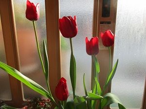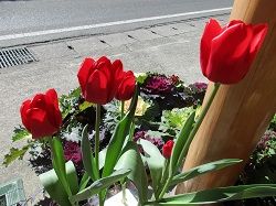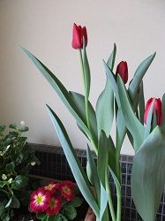 今朝も昨朝も、お墓の花筒の水も花も水入れの水もガチガチに凍っていました。花の水が換えられず、水入れの掃除もできず、お線香だけを上げて帰ってきました。昼間はとてもいいお天気で暖かいので、昼間に散歩に行けばいいのですが、やっぱりその時間はとれません。二女のインターン3日目の朝は主人が送りに行ってくれたので、いつもの時間に散歩に行けてよかったです。写真は、やっと5本とも花が開いた水栽培のチューリップです。