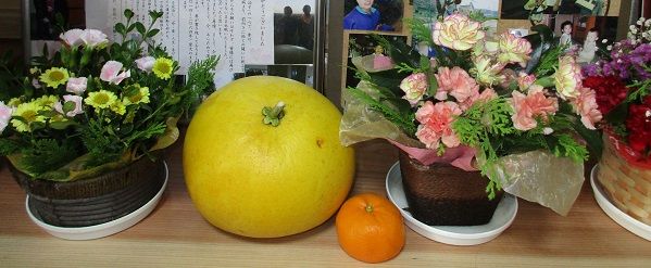 友人と2人で脇町へ華展を見に行ってきました。先に会場近くのカフェでランチを食べました。カレードリアがとても美味しかったです。今年で第10回の華展、私は昨年までにも何度か観に来ていましたが、友人は初めてとのことで誘ったことを喜んでくれました。スケールが大きくて素晴らしい作品ばかりでした。平日だからお客様は少ないかなと思っていましたが、結構たくさんの人が観に来られていて凄いなあと思いました。写真は、友人の家で栽培収穫された晩白柚(バンペイユ)です。こんな大きなみかんがあることにびっくりしました。