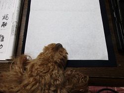 今朝はお墓の花筒の水が固く凍っていました。午後、寒いので炬燵で1月の課題の半紙書きをしました。膝にはモコが乗ってのお習字です。じっとしてくれているので書けます。まだ条幅も書かないといけないので、次回、別の場所で書く予定です。夕方、主人の実家に家族5人で年始のご挨拶に行って来ました。義兄も義姉もお年を重ねられ、お二人とも体調がよくないとのことでとても心配です。