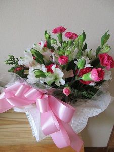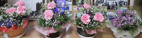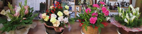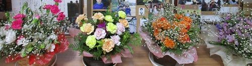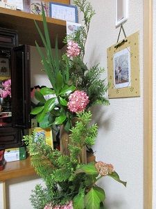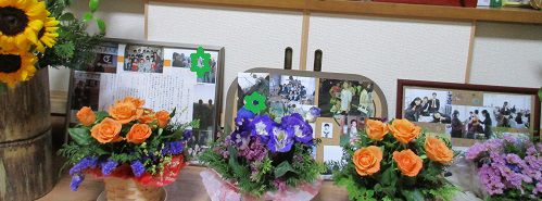 朝早く散歩&お墓参りを済ませ、高松へ1日がかりの花の研究会に行ってきました。5時ちょっと前に帰って来て、モコと車で長女の前のお花を換えに行きました。長女が大好きだった向日葵を生けました。夕食後は仏壇前の花も生け換えました。今年も、さ○○ガーデンの向日葵の開花が楽しみです。写真は、講師先生の作品と長女の前の向日葵です。