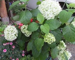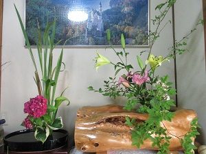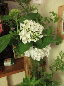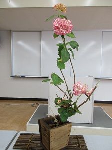 花の研究会で、紫陽花を釣瓶に生けました。男結びの練習もしました。紫陽花の水揚げの難しさも知りました。土曜日のお稽古の後は、切り口を焼いてから深水に浸ける方法で生き返りました。今日は切り口を煮てから深水に浸ける方法をやってみました。弱って萎れていた紫陽花が元気になってくれて嬉しかったです。写真は、講師先生の作品です。