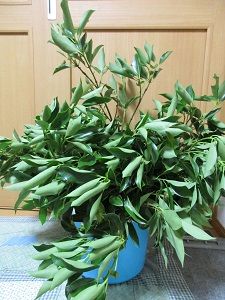 午後、やっとかな半紙を書きました。書いている時に、お寺近くの主人の友人のKさんが来られました。これまでにも度々樒を持って来てくださったことがあるのですが、今日はびっくりぽんでした。何と天井に届きそうなくらい長くて大きな樒を担いで持って来てくださったのです。裏の部屋で、早速ちょうどよい大きさに切りました。大きなバケツが樒でいっぱいになりました。Kさんに感謝感謝です。
