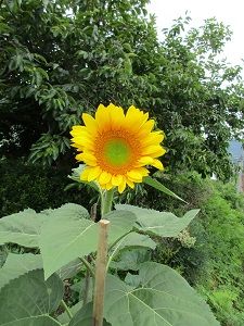 朝、いつもの時間に、犬たちの散歩&お墓参りに出かけました。今年初めて切り取った百日草を束にして持って行きました。半分くらい来たところで大粒の雨が降り出しびっくり、引き返そうかとも思ったけれど、やっぱり行きました。花を綺麗に生けて、お線香は立てずに近道を急ぎ足で帰ってきました。長女の向日葵がやっと開花、もうすぐ丸3年を迎えます。