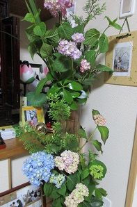 梅雨入りして、朝からずっと雨でした。昨朝、玄関の紫陽花を4本手折って長女の前に生けてきたのが水揚げしているかなと思いながら、昨日水揚げして元気になった紫陽花を生けました。亀や沢蟹の水槽の水替えをしたり、久しぶりに手紙を書いたり、習字やダンスの練習をしたりの1日でした。