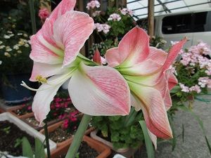 午後、義兄姉のお家に行ってお庭のプランターと鉢に百日草を植えてきました。お二人とも体調が優れず、「頼むわ。」と言われていました。雨が降る前がいいと思い、苗と土と肥料を持って行って5つのプランターと1つの大鉢に苗を植えてきました。車椅子の義姉がちょっと高いベランダに出てきてくれておしゃべりしながらの作業になりました。大きく育って綺麗に咲いてくれたらと思います。写真は、さ○○ガーデンのアマリリスともう少しで咲きそうな向日葵です。