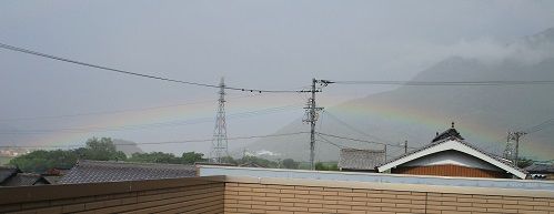 朝からとても蒸し暑い1日でした。午後3時過ぎから雨が降り出しました。だんだんたくさん降ってきて暗かったのに、4時すぎにはお日様が出て急に明るくなりました。でも、雨がたくさん降っている「お天気雨」です。どこかに虹ができるはずと思い、2階に上がって外を見ました。すると、東の空の低いところに虹がかかっていました。こんな低くてカーブの緩い虹を見るのは初めてのことでした。