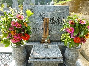 一昨日買ったばかりの樒、昨日の朝、墓前に生けたばかりだったのに、数時間後に友人とお参りに行ったら暑くてしょんぼりしていました。昼間は暑いから仕方ないけど、朝になったら生き生きしているかもと今朝行くと、やっぱりしょんぼりしていて残念。昨日友人がくれた根付き樒と百日草を持っていって生け直してきました。今日も1時間余り草刈りをしましたが、仕上がりはまだまだです。ぼちぼち頑張ります。