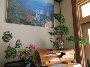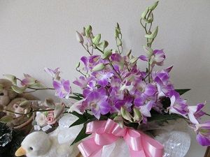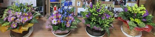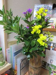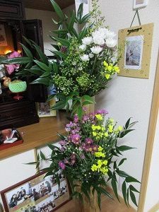 台風18号が接近していて警報が出ている中、高松へ花の会に行って来ました。いつものバスは運休、友人の車で行きました。朝は晴れ間も出て散歩&お墓参りにも行けて、午前中は全く降らずでしたが、いつもより2時間早く13時に会が終了しました。帰り、猪ノ鼻峠辺りから雨が降り出して、その後は大雨から暴風雨になりました。夜になって、雨戸を打ち付ける風雨が激しく雷も鳴って台風通過の凄さと怖さを感じました。写真は、講師先生の作品です。