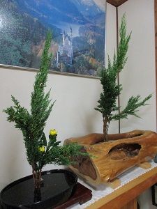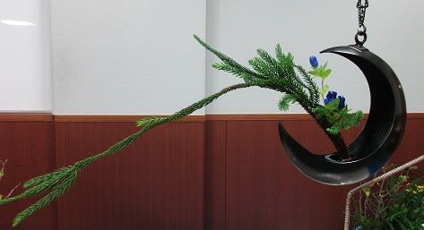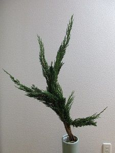 花の会のお当番だったので、9時前に着くように行きました。いつもは10時頃に行っていたので、開始時刻の10時半までが長かったです。役員さんは9時前に、その他の皆さんは9時半過ぎから次々来られているのを見て、次回からはもう少し早く着くように行かなければと思いました。午後の実技の伊吹の五行格、何とか生けられてよかったです。写真は、帰って生け直した伊吹です。